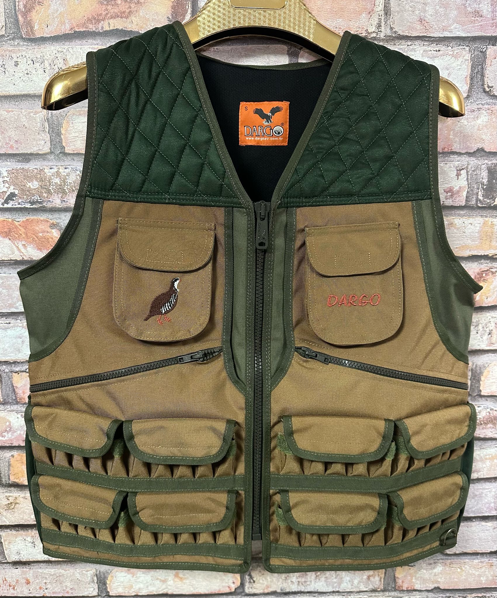 Dargo av yeleği Cordura Kumaştan imal edilmiştir. Astarlı ve arasında sıvı geçirmez bölme bulunmaktadır. Ön tarafta 40 adetlik fişeklik ve 2 ayrı bölme bulunmaktadır. Yelek yanlarında iki adet özel lastikli ve fermuarlı cep/suluk bulunmaktadır. Sıvı geçirmez geniş arka sırt çantası önde kalın kemik fermuar.